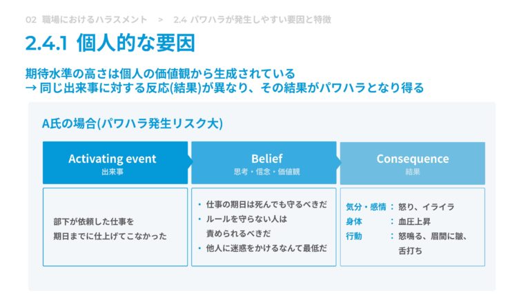 パワハラと相関のある特性については研究が進んでいます。講座の中では、そうした特性がなぜパワハラ行為につながるかを認知行動学のABC理論で解説しています。単に性格の問題で片付けず、メカニズムを理解することで、自身の行動の改善だけでなく管理職に登用する人材選定の際などにも活かすことができます。
