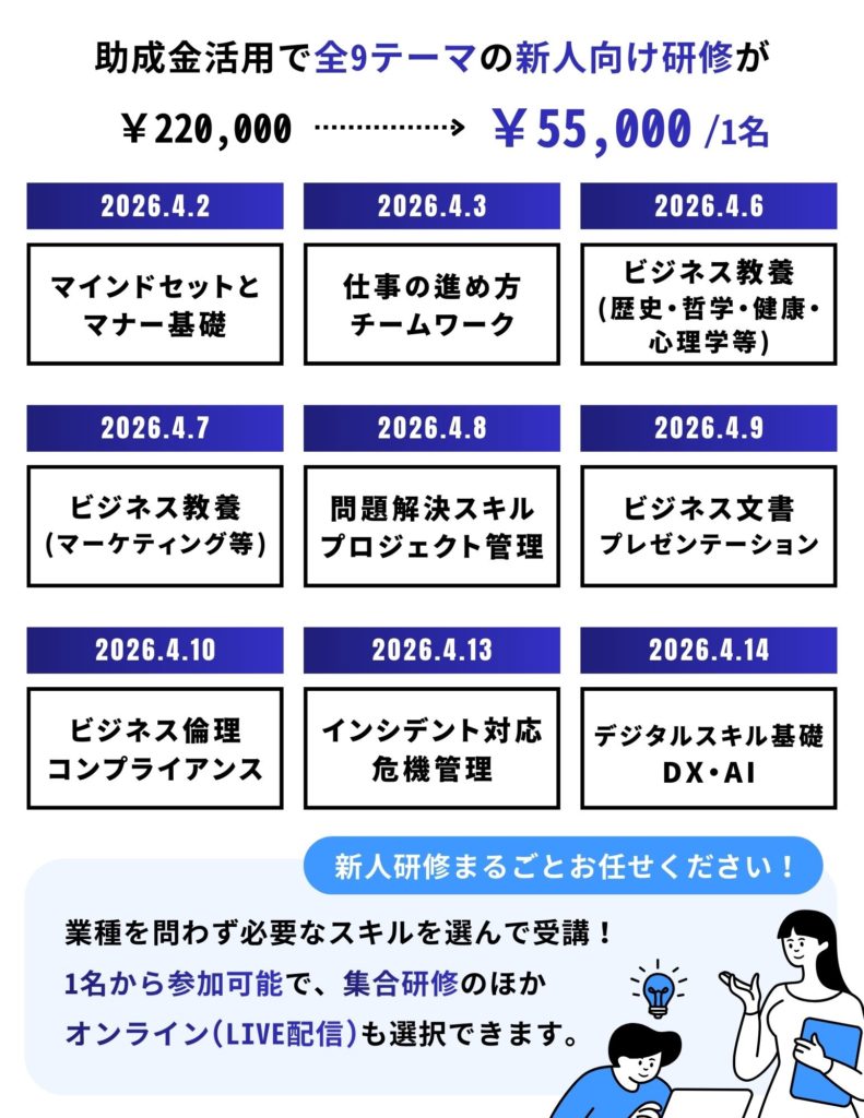 - 1日1テーマ・全9テーマから必要な講座を選択可能(ビジネス基礎研修)