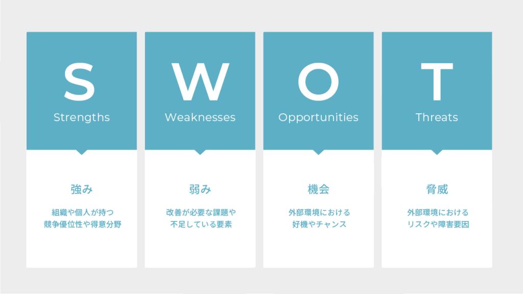 SWOT分析とは、組織や個人の現状を4つの観点から分析するフレームワークです。SWOTは以下の英単語の頭文字を取った略語となっています。