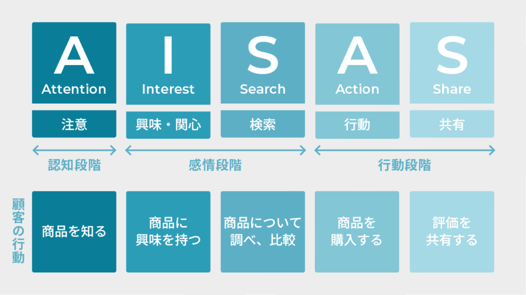 Attention(注意) → Interest(関心) → Search(検索) → Action(行動) → Share(共有)